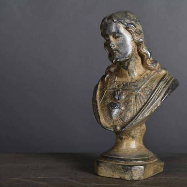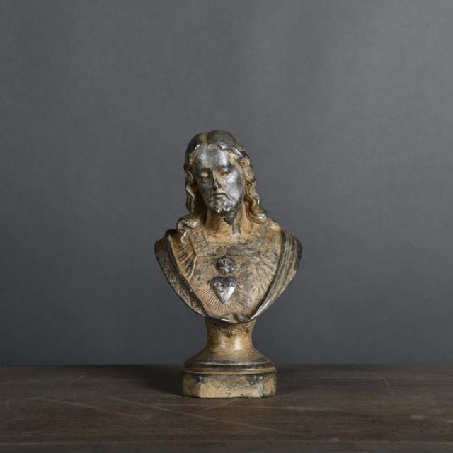 Fidèle réédition d'un buste "Sacré Cœur", représentatif des statues religieuses en vogue au 19ème siècle de Rome à Lourdes, sans oublier Paris où la célèbre Maison Raffl mit en œuvre une technique de moulage qui permit leur démocratisation.