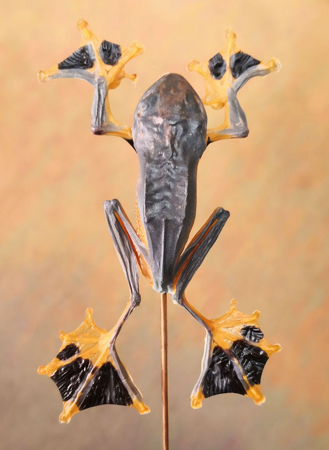 Surnommé grenouille volante à cause de ses palmures entre les doigts qui lui permettent de planer de branches en branches parfois sur des distances jusqu'à 12m.