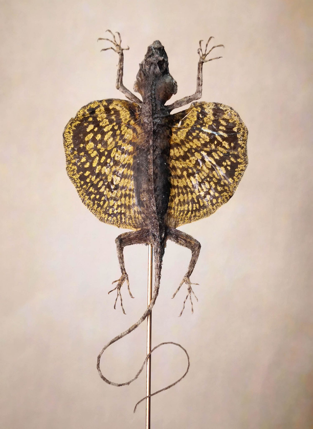 Draco haematopogon est un genre de lézards connus sous le nom de lézards volants. Ces lézards sont capables de planer ; leurs côtes et leur membrane de liaison peuvent être prolongées pour créer des ailes.