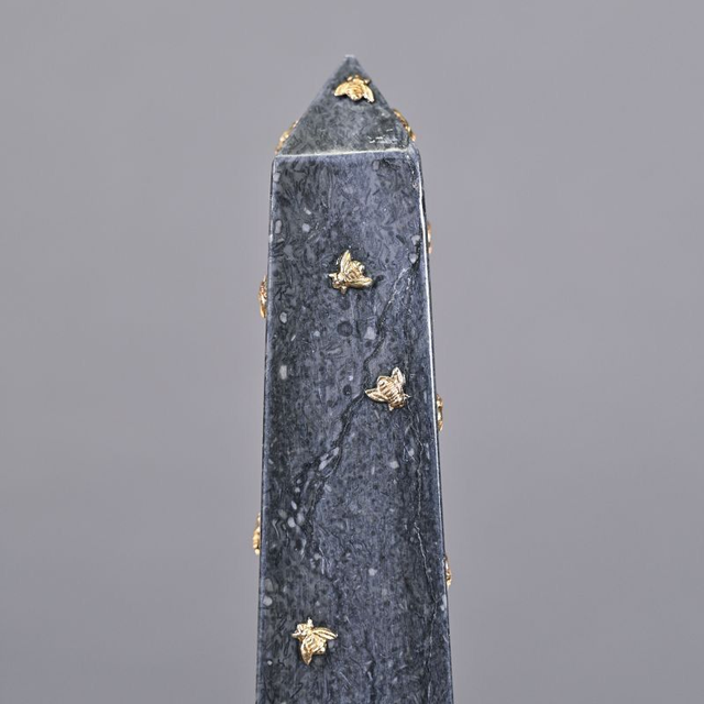 Bel obélisque en marbre gris-noir, reproduit à l'identique de ceux qui ornaient les consoles des grandes demeures au XIXᵉ siècle. Finement rehaussé de petits motifs dorés à l'effigie d'abeilles, chaque obélisque est minutieusement serti à la main dans nos ateliers. Le thème de l'abeille, très en vogue à l'époque Empire, reste un symbole d’immortalité encore de nos jours et donne toute son élégance à cet objet culte, toujours très déco. Fabriqués et sculptés à la main par nos artisans, patinés et polis dans les règles de l'art, nos obélisques vous séduiront par leur authenticité.